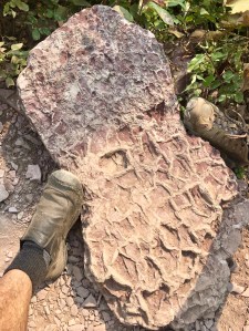 G loved the geology along the way. This rock (framed by our boots) probably lay at one point on the bottom of an ancient sea. You can see the fossilized marine life in it.