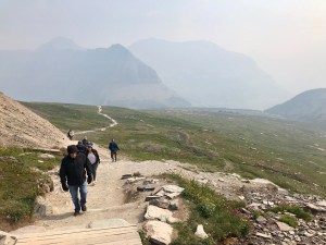 We can’t see Grinnell Glacier mainly because of the smoke. But even on clear days it’s but a spot in the distance. Climate change has shrunk it from 252 acres in 1966 to 139 acres in 2015.
