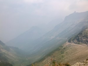 Here’s the “view” from the Continental Divide at Logan Pass, looking from the east side of the park to the west side of the park. The entire western portion of the Road-to-the-Sun – a portion of which is in this photo – is closed due to fire danger. (The Highline Trail – barely visible in this pic running roughly parallel to and above the Road-to-the-Sun – is also closed, but for a different reason: Bears.)