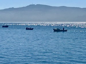 Here’s the best I could do before my phone froze. The whale is to the right of the foaming water and has just shot a spray of water into the air.