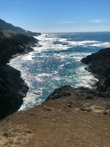 Another afternoon we watched a half dozen spray-spouting gray whales cruise back and forth just off shore at Depoe Bay State Park. We saw several more at Rocky Creek. My iPhone picked this particular moment in time to malfunction so I missed recording the perfect tail-in-the-air wave one whale gave us, but it will live in my mind’s eye forever.