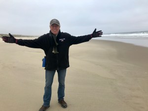 It wasn’t all sunshine and brightness. One day we could hardly see the coast for all the fog. And it rained a lot. At Oregon Dunes National Recreation Area, we bundled up for a three-mile loop walk out to the beach and back from our Waxmyrtle campsite. Here’s what it looked like when we got there.