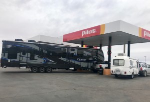 (I couldn’t resist snapping this picture of the rig that pulled up next to us at the gas station en route. We’ve never seen what must be about a 50-foot fifth wheel before. Note the triple axle. Can you imagine trying to park that monster? It’s size sure keeps us humble.)